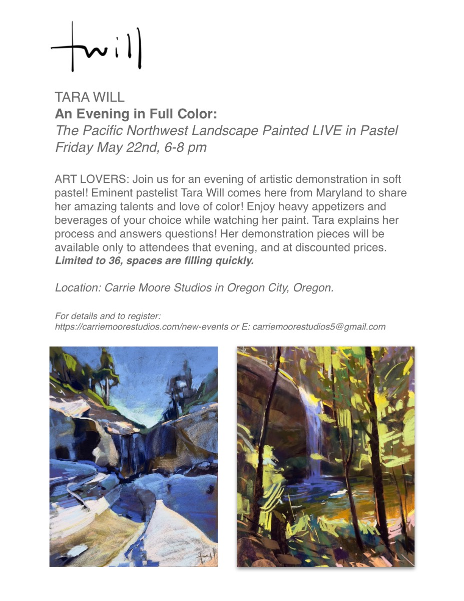 Tara Will, Eminent pastelist from Maryland comes to Oregon City’s Carrie Moore Studios for a LIVE 2 hour soft pastel painting demo. Food & beverages included!