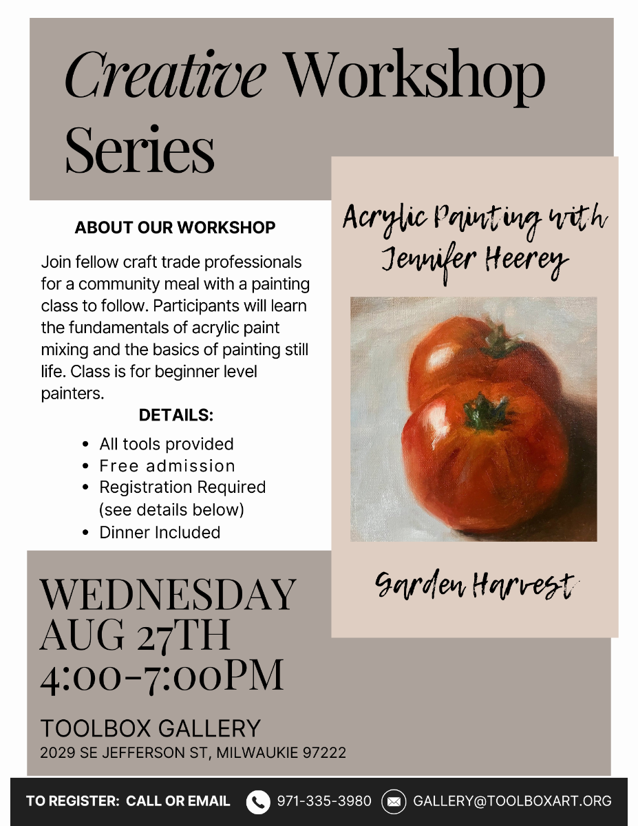 Join us for a chance to build community and learn the basics of acrylic painting. Class begins with a community meal and conversation, followed by a hands-on workshop taught by Artist Jennifer Heeley. Participants will learn the fundamentals of paint mixing and still life. Registration is required. Please call or email Toolbox Gallery at (971)335-3980 […]