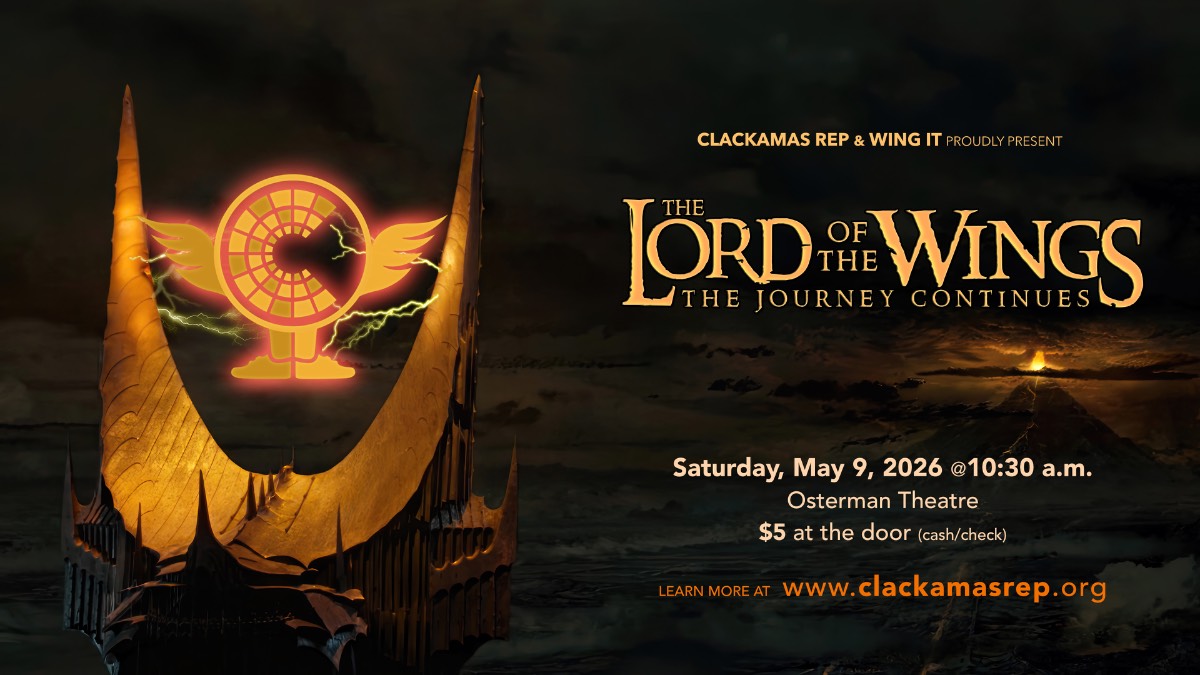 May 9 Lord of the Wing: The Journey Continues 10:30 am - 11:30 am Clackamas Repertory Theater 19600 Molalla Ave, Oregon City Event Details Get Directions