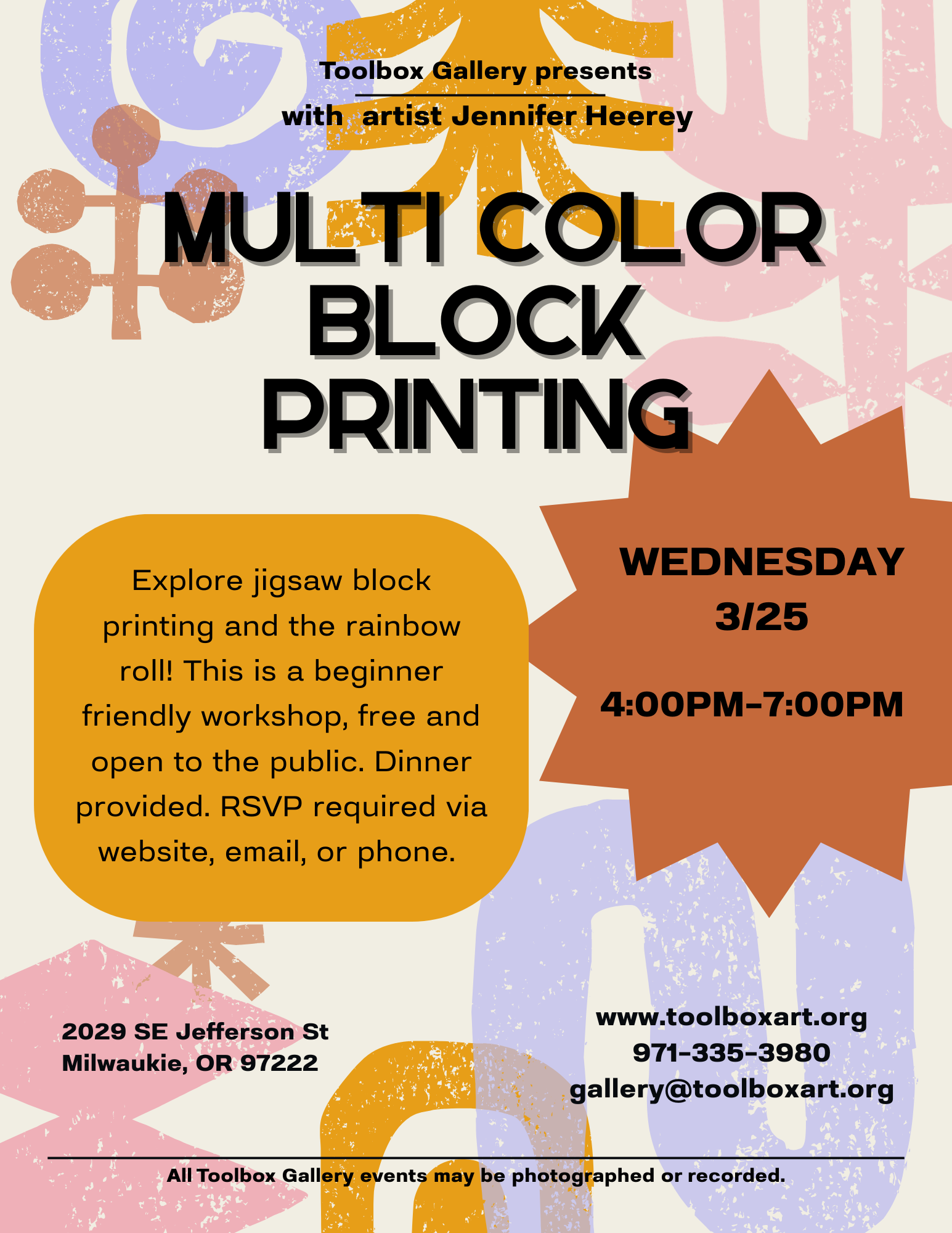 Mar 25 Multi Color Block Printing 4:00 pm - 7:00 pm Toolbox Gallery 2029 SE Jefferson St., Milwaukie Event Details Get Directions